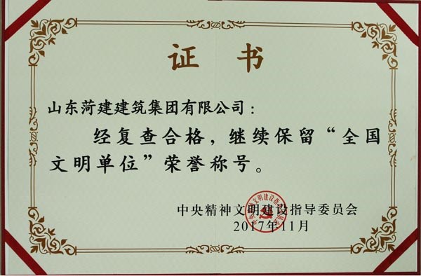 集團(tuán)公司繼續(xù)保持“全國文明單位”榮譽(yù)稱號,即是對文明創(chuàng)建工作的肯定,也是一種鞭策和激勵(lì)。文明創(chuàng)建永遠(yuǎn)在路上,下一步工作中,集團(tuán)公司將不忘初心,繼續(xù)前進(jìn),深入鞏固和擴(kuò)大全國文明單位創(chuàng)建成果,為打造“百年菏建”做出新的更大的貢獻(xiàn)。