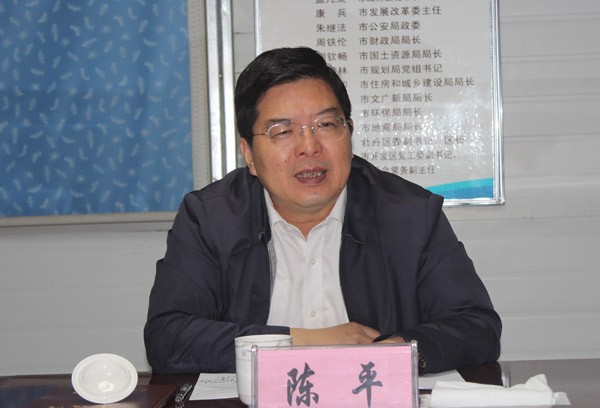集團黨委書記、董事長李信強(左一)向陳平市長匯報項目情況