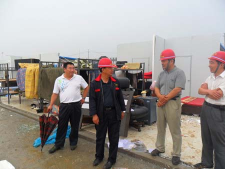 六月二十三日黎明五點(diǎn)左右,一陣突如其來的暴風(fēng)雨襲擊了菏建集團(tuán)承建的開封龍大工地,幾十間彩板房(近700余平方米)傾刻之間被大風(fēng)從原地卷走,腰粗的高壓電線桿瞬間被折斷,造成大面積、長時(shí)間停電,勞累一天的工人們從夢中驚醒,部分工人的衣服被狂風(fēng)卷到百米以外的田地里,當(dāng)時(shí)天上還下著瓢潑大雨,衣服、被子等全部被雨鋟泡,項(xiàng)目經(jīng)理朱茗同志從廢墟中摸出來后,首先察看大家是否受傷,把個(gè)別遭受輕外傷的工人進(jìn)行簡單的包扎后,并立即帶領(lǐng)大家展開自救,對(duì)被淋濕的技術(shù)資料,圖紙及其他辦公用品進(jìn)行妥善處理,把庫存成捆的工作服打開后及時(shí)發(fā)到工人手中,安排工人解決吃飯、住宿問題,對(duì)當(dāng)天在工地住宿確實(shí)有困難的女職工聯(lián)系賓館,一切善后工作都在項(xiàng)目經(jīng)理朱茗同志的帶領(lǐng)下有條不紊的進(jìn)行著,同時(shí)將這次意外情況向集團(tuán)公司分管領(lǐng)導(dǎo)進(jìn)行了電話匯報(bào)。 集團(tuán)公司分管領(lǐng)導(dǎo)及時(shí)向張廣周總經(jīng)理作了匯報(bào),張總經(jīng)理馬上委托分管經(jīng)理及安全部的同志趕赴工地,進(jìn)一步了解具體情況……。