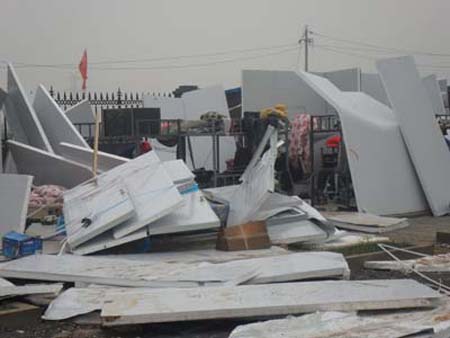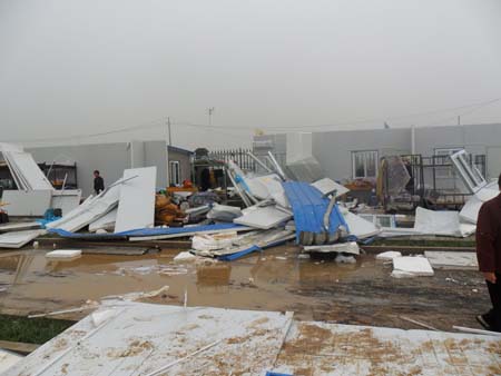 這次大風(fēng)雖然摧毀了辦公區(qū)域所有臨時(shí)設(shè)施,有幸的是,所有職工除個(gè)別皮膚被劃傷外大都安然無恙??看u圍墻搭建的上百間彩板房除個(gè)別屋頂糟破壞外,其它并無大礙。這次大風(fēng)對(duì)整個(gè)工程的質(zhì)量、工期不受任何影響,通過這次大風(fēng)襲擊,我們從中值得接受教訓(xùn)是:尤其是對(duì)我們長期野外作業(yè)的施工單位來說,彩板房的搭建如何加大抗風(fēng)襲擊的措施應(yīng)是以后首先考慮的問題之一。