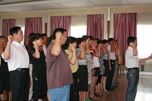 6月30日上午,集團(tuán)在六樓會(huì)議室舉行慶祝建黨89周年重溫入黨誓詞宣誓活動(dòng)。在神圣而又莊嚴(yán)的儀式上,黨委副書記郭武代表集團(tuán)黨委在講話中指出,入黨宣誓是神圣的、非常有意義的活動(dòng),體現(xiàn)了入黨的莊重性和嚴(yán)肅性。他希望全體黨員要時(shí)刻牢記黨的誓言,積極履行黨員義務(wù),嚴(yán)格要求自己,做一名合格的共產(chǎn)黨員,在各自崗位上扎實(shí)工作、無私奉獻(xiàn),積極為企業(yè)的又好又快做出應(yīng)有貢獻(xiàn)。隨后,在黨委辦公室主任韓明的領(lǐng)讀下,部分單位黨支部書記、機(jī)關(guān)黨員代表和09年度預(yù)備黨員共40余人,面對(duì)鮮紅黨旗,鄭重舉起右手,進(jìn)行了入黨宣誓,重溫入黨誓詞。