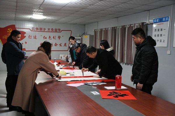 本次活動(dòng),邀請7名菏澤市知名書法家和3名公司老領(lǐng)導(dǎo)分別到菏建集團(tuán)、蘆莊施工項(xiàng)目和物業(yè)公司為職工現(xiàn)場書寫春聯(lián)和福字。活動(dòng)現(xiàn)場氣氛熱烈,書法家們揮毫潑墨,將祝福與激情傾注筆端,融入創(chuàng)作,頃刻間,一張張紅紅火火、喜氣洋洋的福字,一幅幅寓意喜慶、滿載祝福的春聯(lián)便完成。本次活動(dòng)歷時(shí)3個(gè)小時(shí)左右,共書寫200余幅春聯(lián)和福字,得到了職工稱贊和好評。