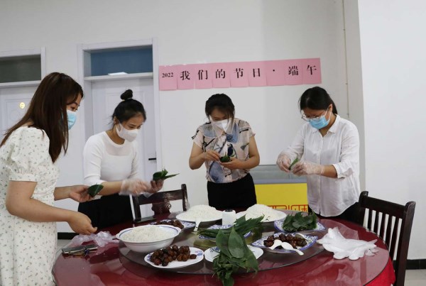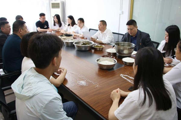 菏建教育公司開(kāi)展了包粽子活動(dòng)。活動(dòng)現(xiàn)場(chǎng)提前準(zhǔn)備好了糯米、粽葉、紅棗。從未包過(guò)粽子的“年輕人”虛心向“老師傅”學(xué)習(xí)請(qǐng)教,在認(rèn)真學(xué)習(xí)了選葉、折葉、盛料、壓實(shí)、裹葉、扎繩等包粽子的步驟后,大家圍站在一起,紛紛上手、互幫互學(xué)。只見(jiàn)一雙雙巧手上下?lián)]動(dòng),一片片粽葉、一粒粒糯米,在大家手中,變成了香甜可口的粽子,整個(gè)活動(dòng)現(xiàn)場(chǎng)洋溢著歡聲笑語(yǔ)。
