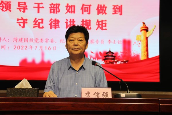 7月16日上午,菏建國投黨委常委、紀委書記、監(jiān)察專員李士欽以“領(lǐng)導干部如何做到守紀律講規(guī)矩”為主題,為公司黨員干部上了一堂生動的廉政專題黨課。菏建國投黨委書記、董事長李信強主持會議。菏建國投領(lǐng)導班子全體,國投機關(guān)中層副職及以上同志、全體黨員,菏建集團領(lǐng)導班子全體、各處室負責人、權(quán)屬各單位主要負責人,國投各權(quán)屬單位領(lǐng)導班子全體同志參加會議。