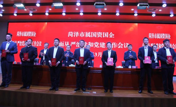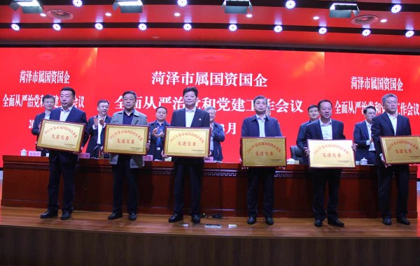 ![]() 菏建國投黨委書記、董事長李信強(qiáng)(前排左三)領(lǐng)取“先進(jìn)黨委”獎 |