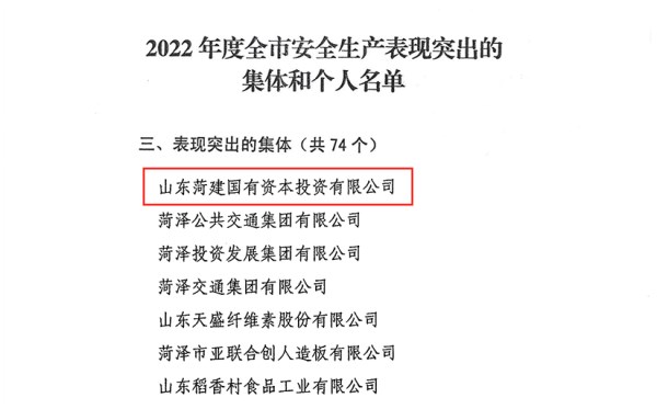 近日,菏澤市委市政府發(fā)布《關(guān)于表揚2022年度全市安全生產(chǎn)表現(xiàn)突出的集體和個人的通報》,山東菏建國投榮獲菏澤市2022年度安全生產(chǎn)工作“表現(xiàn)突出集體”稱號。