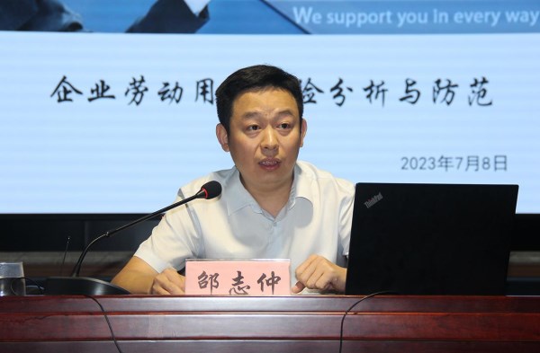 在講課中,邵志仲圍繞“企業(yè)勞動(dòng)用工風(fēng)險(xiǎn)分析與防范”,從勞動(dòng)用工法律風(fēng)險(xiǎn)、用工模式風(fēng)險(xiǎn)防范、招聘錄用風(fēng)險(xiǎn)防范、勞動(dòng)合同風(fēng)險(xiǎn)防范和職工離職風(fēng)險(xiǎn)防范等五個(gè)方面,結(jié)合目前公司在勞動(dòng)用工方面存在的問(wèn)題和風(fēng)險(xiǎn)隱患進(jìn)行了詳細(xì)闡述。
