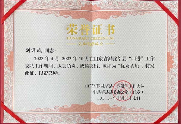![]() 劉遠斌同志被山東省派駐莘縣“四進”工作支隊和中共莘縣縣委辦公室評為“優(yōu)秀隊員” |