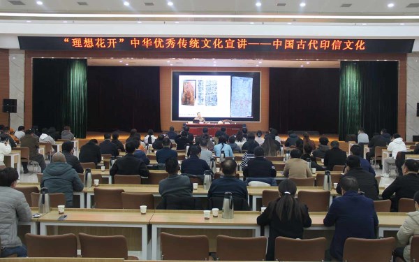 劉海宇教授從古璽印的起源、古璽印的內(nèi)容與分類、古璽印的使用方法、古璽印的等級與組綬等幾個方面概述我國古代的印信文化及其特征,宣講了中國古代印信文化的內(nèi)涵、特征及歷史影響,使現(xiàn)場人員充分聆聽“信”之聲,切實感受“信”之美,一起見證了中華民族以信為本的優(yōu)良傳統(tǒng)。