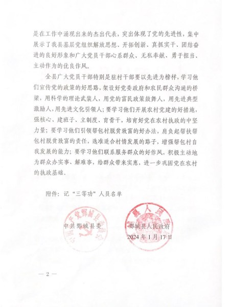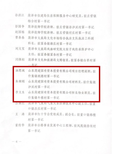 近日,中共鄄城縣委、鄄城縣人民政府發(fā)布關(guān)于獎(jiǎng)勵(lì)省、市派第一書(shū)記和工作隊(duì)員的決定,菏建國(guó)投選派第一書(shū)記油愿誠(chéng)、朱繼剛、李文生等三名同志榮獲個(gè)人“三等功”。