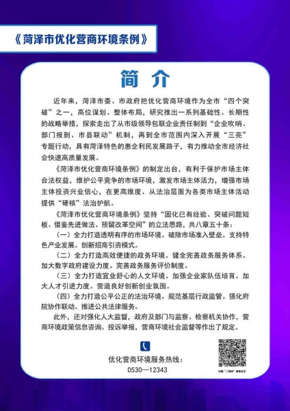 深入實施《菏澤市優(yōu)化營商環(huán)境條例》,著力打造高效便捷的政務(wù)環(huán)境、公平公正的法治環(huán)境、誠信守諾的社會環(huán)境、透明有序的市場環(huán)境