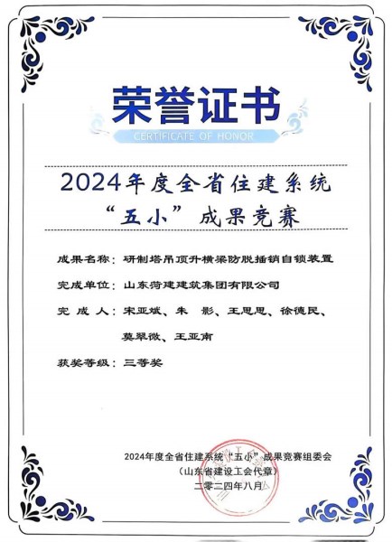 為深入貫徹落實(shí)省委省政府、市委市政府關(guān)于安全生產(chǎn)系列決策部署,激發(fā)廣大職工的創(chuàng)新創(chuàng)造能力,今年以來,菏建集團(tuán)深入開展“五小”成果創(chuàng)新活動(dòng),廣泛收集職工編寫的好建議、好做法、好成果。近期,由菏建集團(tuán)職工宋亞斌為第一完成人編寫的“研制塔吊頂升橫梁防脫插銷自鎖裝置”項(xiàng)目在全省住建系統(tǒng)“五小”成果競(jìng)賽中脫穎而出,榮獲三等獎(jiǎng)。