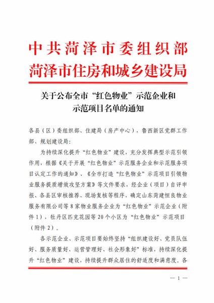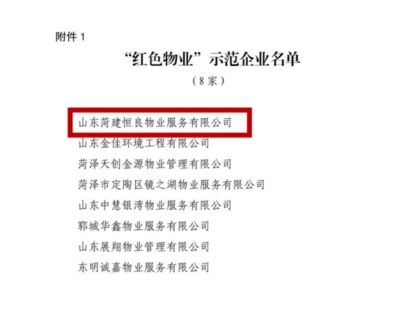 近日,市委組織部、市住房和城鄉(xiāng)建設局聯(lián)合發(fā)布文件,對全市紅色物業(yè)示范企業(yè)及示范項目進行通報表揚。山東菏建恒良物業(yè)服務有限公司憑借突出的黨建引領作用、卓越的服務品質(zhì)和顯著的工作成效,榮獲“紅色物業(yè)示范企業(yè)”稱號;公司所管理的新河灣及賈宋莊項目,在眾多項目中脫穎而出,榮獲“紅色物業(yè)示范項目”稱號。