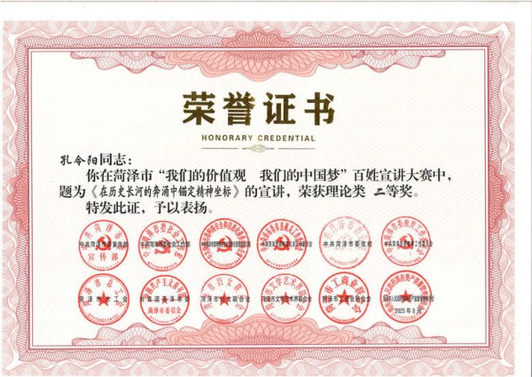 8月13日,在菏澤市“我們的價值觀 我們的中國夢”百姓宣講大賽決賽中,菏建國投孔令陽榮獲理論類二等獎。
