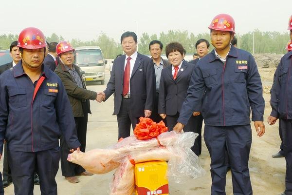 演出之前,總經(jīng)理李信強(qiáng)等集團(tuán)領(lǐng)導(dǎo)為奮戰(zhàn)在濱河春天工地的施工人員送去了豬肉、酒類(lèi)等慰問(wèn)品。